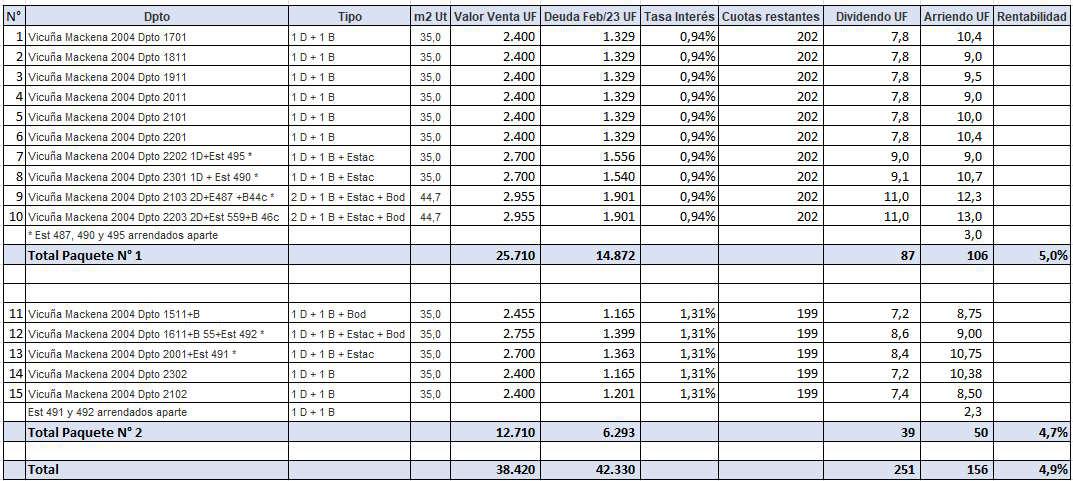 Paquete 1: 10 unidades ( 8 de 35 m2 útiles y 2 de 44.7 m2 útiles más bodega) y 4 estacionamientos (3 de ellos arrendados aparte).